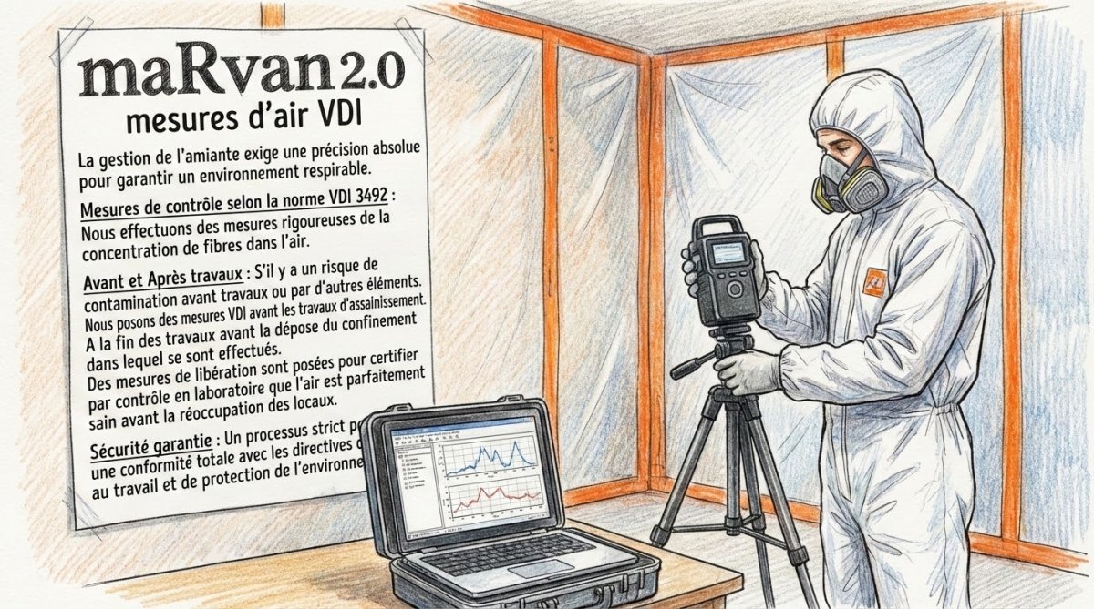- Avant et Après travaux : S’il y a un risque de contamination avant travaux ou par d’autres éléments. Nous posons des mesures VDI avant les travaux d'assainissement. A la fin des travaux avant la dépose du confinement dans lequel se sont effectués. Des mesures de libération sont posées pour certifier par contrôle en laboratoire que l'air est parfaitement sain avant la réoccupation des locaux.